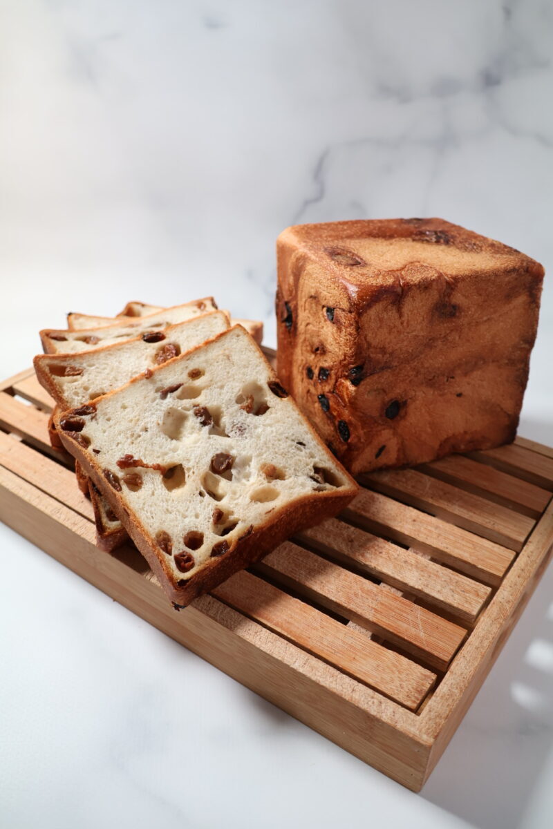 自家製天然酵母で仕込んだ、もっちりとした食感のパン・ド・ミに、ジューシーなドライレーズンを練り込みました。